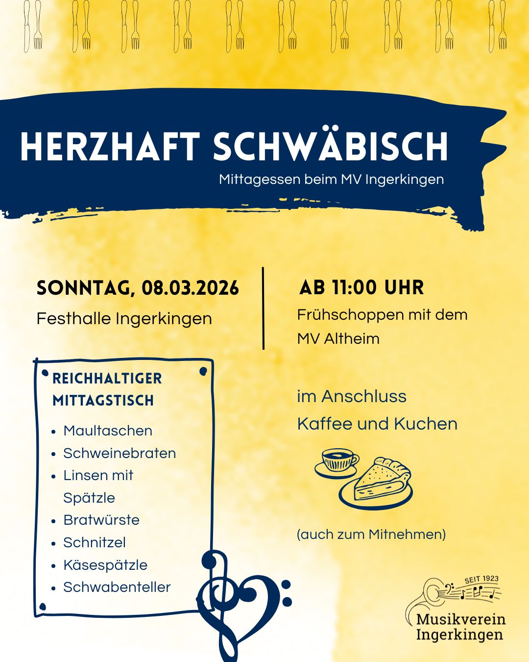 Die wilden Tage der Fasnet sind vorbei, höchste Zeit wieder auf feste Nahrung zurückzugreifen. Der Musikverein lädt auch dieses Jahr wieder zu Herzhaft Schwäbisch ein: